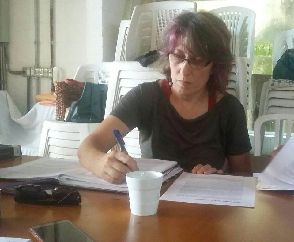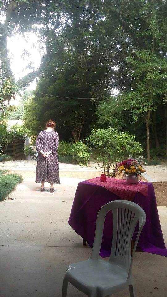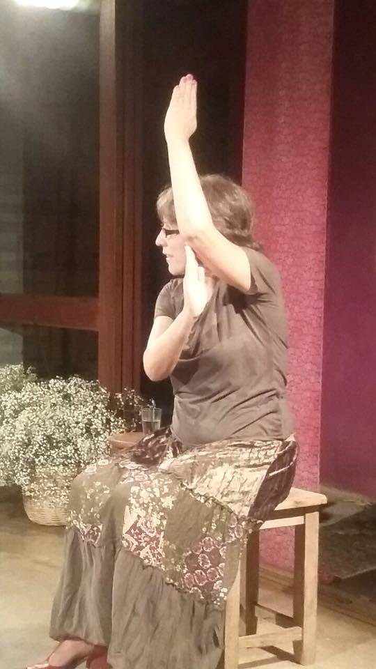 - Regina, a pedido do grupo, aguardando para receber os presentes. Dia de estudo e comemoração surpresa do aniversário de Regina Machado. Abril de 2018.