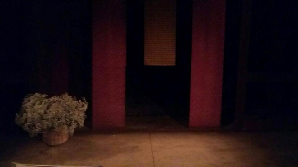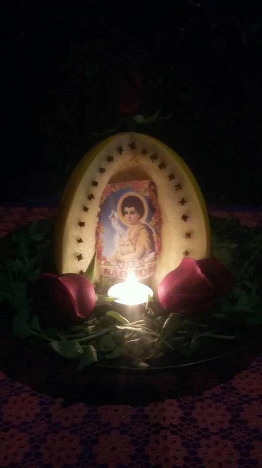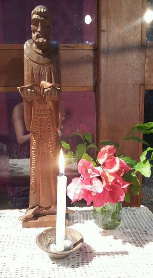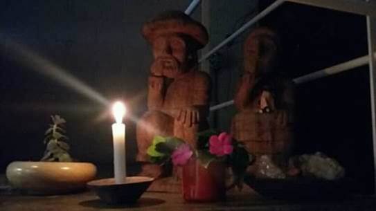 - Parte do cenário composto por santo e vela. Noite de apresentação: Pra que o mundo não acabe! Contos de Pedro Malazarte. Dezembro de 2016.