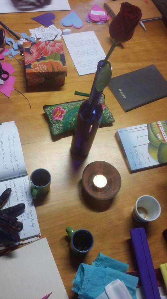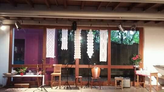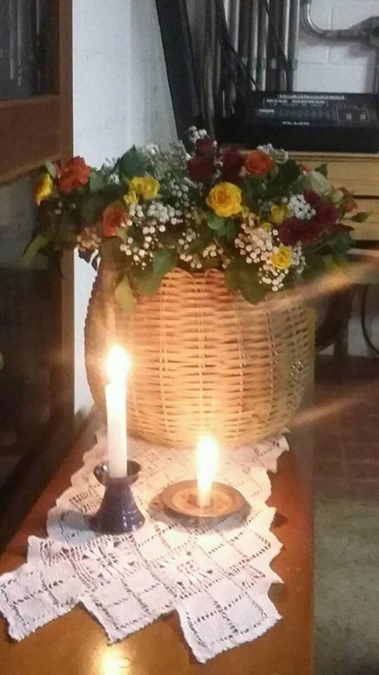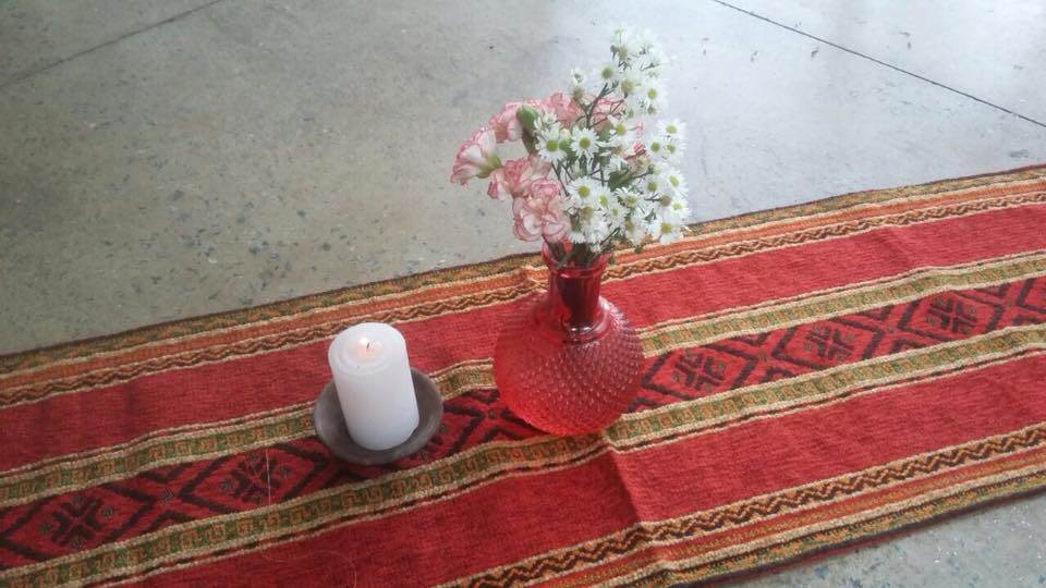 - Flores e velas compondo o cenário. Noite de ensaio aberto. Falta muito? Contos a caminho. Exposição do processo de estudo das histórias. Setembro de 2017.