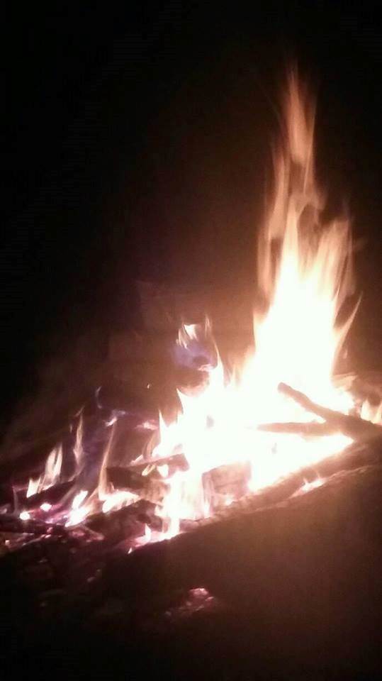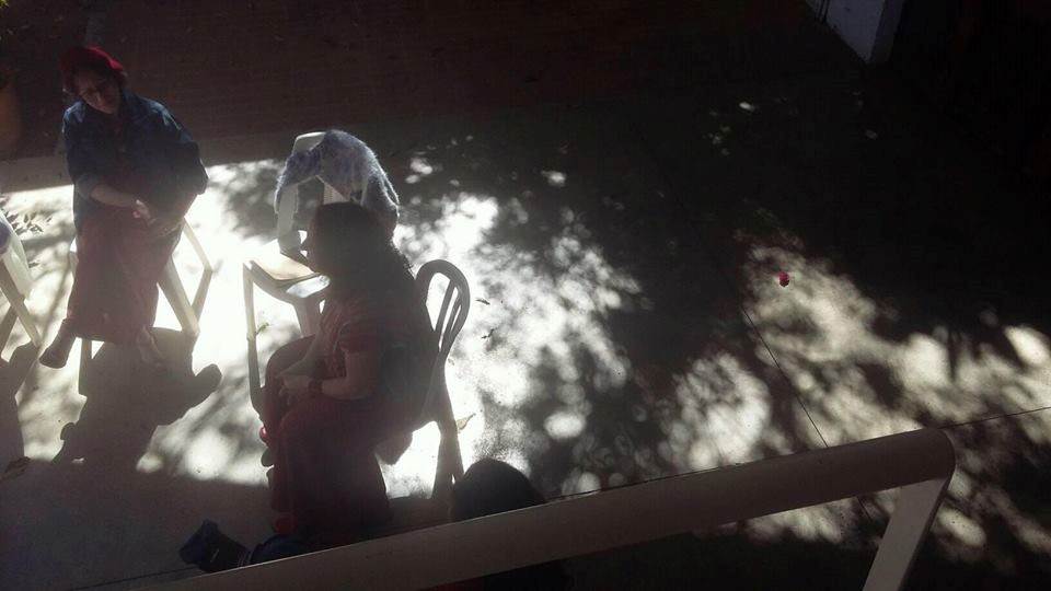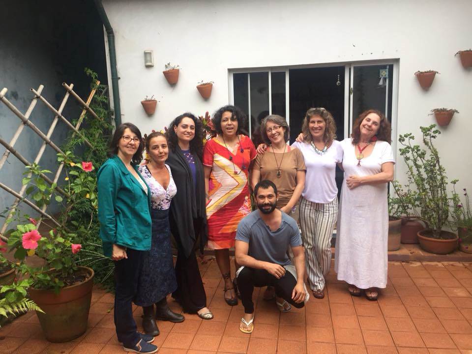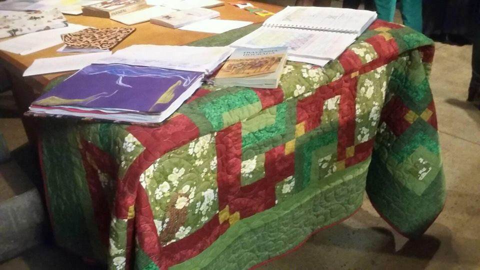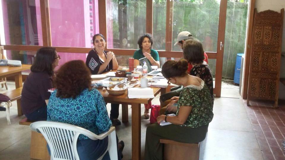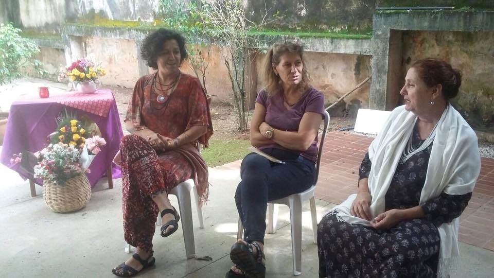 - Composição do centro da roda de histórias. Dia de estudo e comemoração surpresa do aniversário de Regina Machado. Abril de 2018.