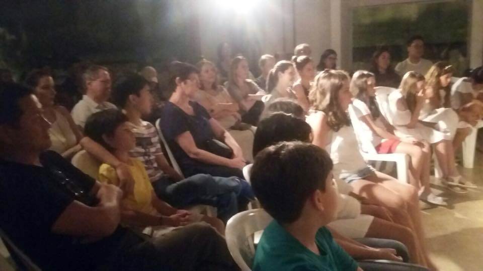 - Parte do público, juntamente com crianças da escola Stance Dual School que também contaram histórias. Noite de apresentação. Contos da lebre de março. Março de 2017.