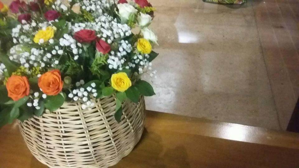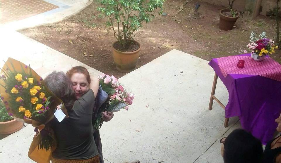 - Regina recebendo de cada participante do grupo abraços e flores, que juntas formaram um grande buquê. Dia de estudo e comemoração surpresa do aniversário de Regina Machado. Abril de 2018.