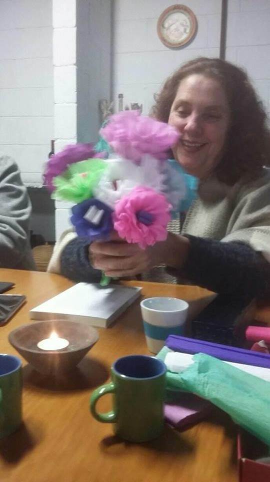 - Estudando e produzindo buquê de flores de crepom para decorar a festa. Dia de estudo e festa julina do grupo. Julho de 2018.