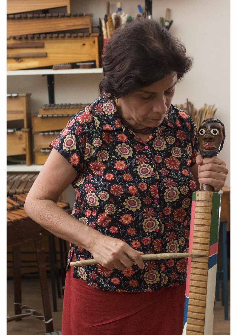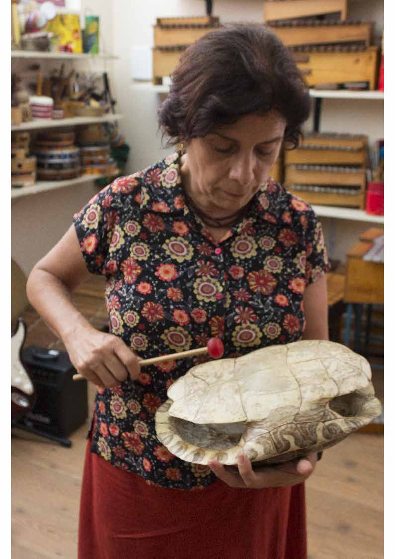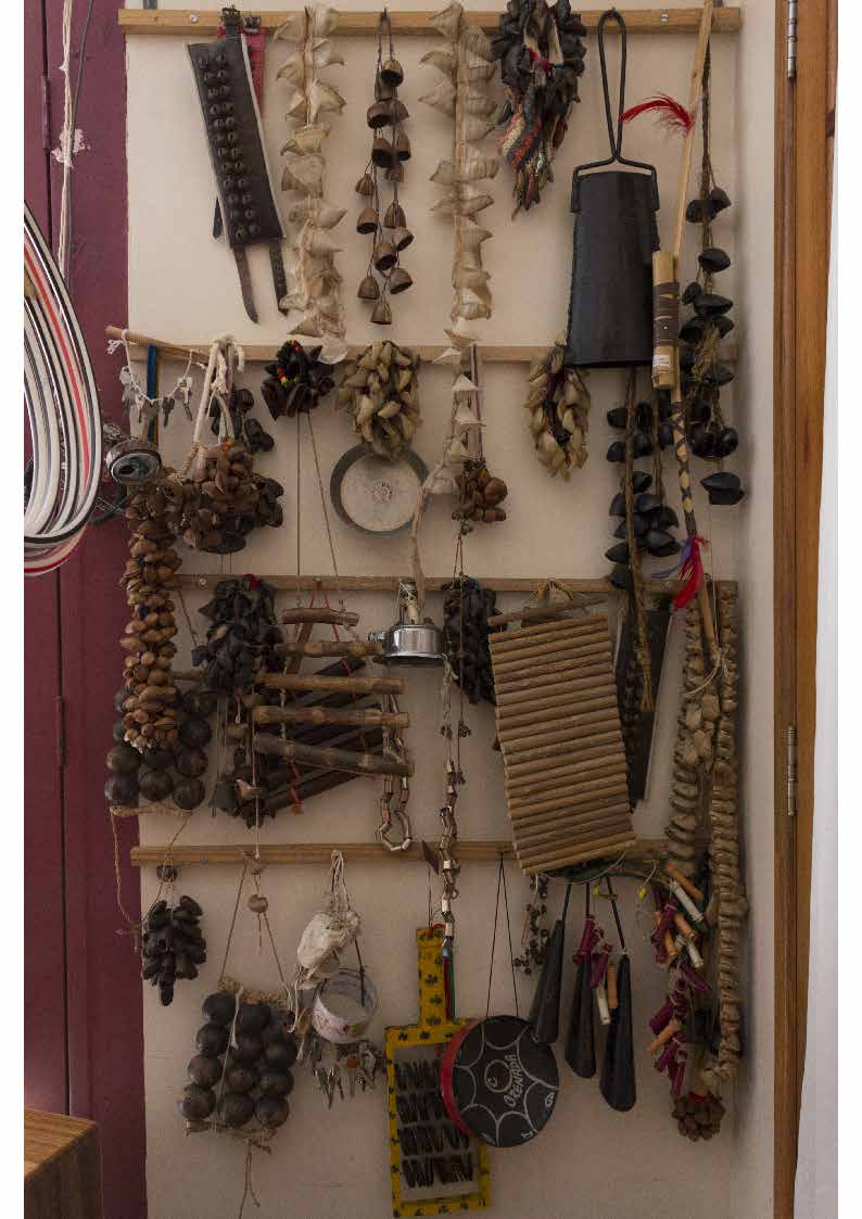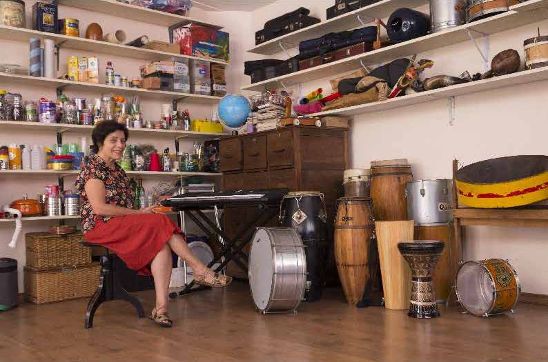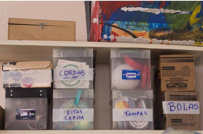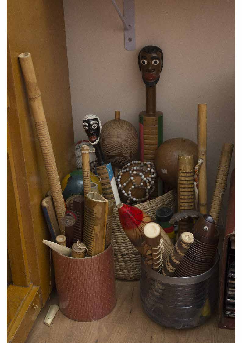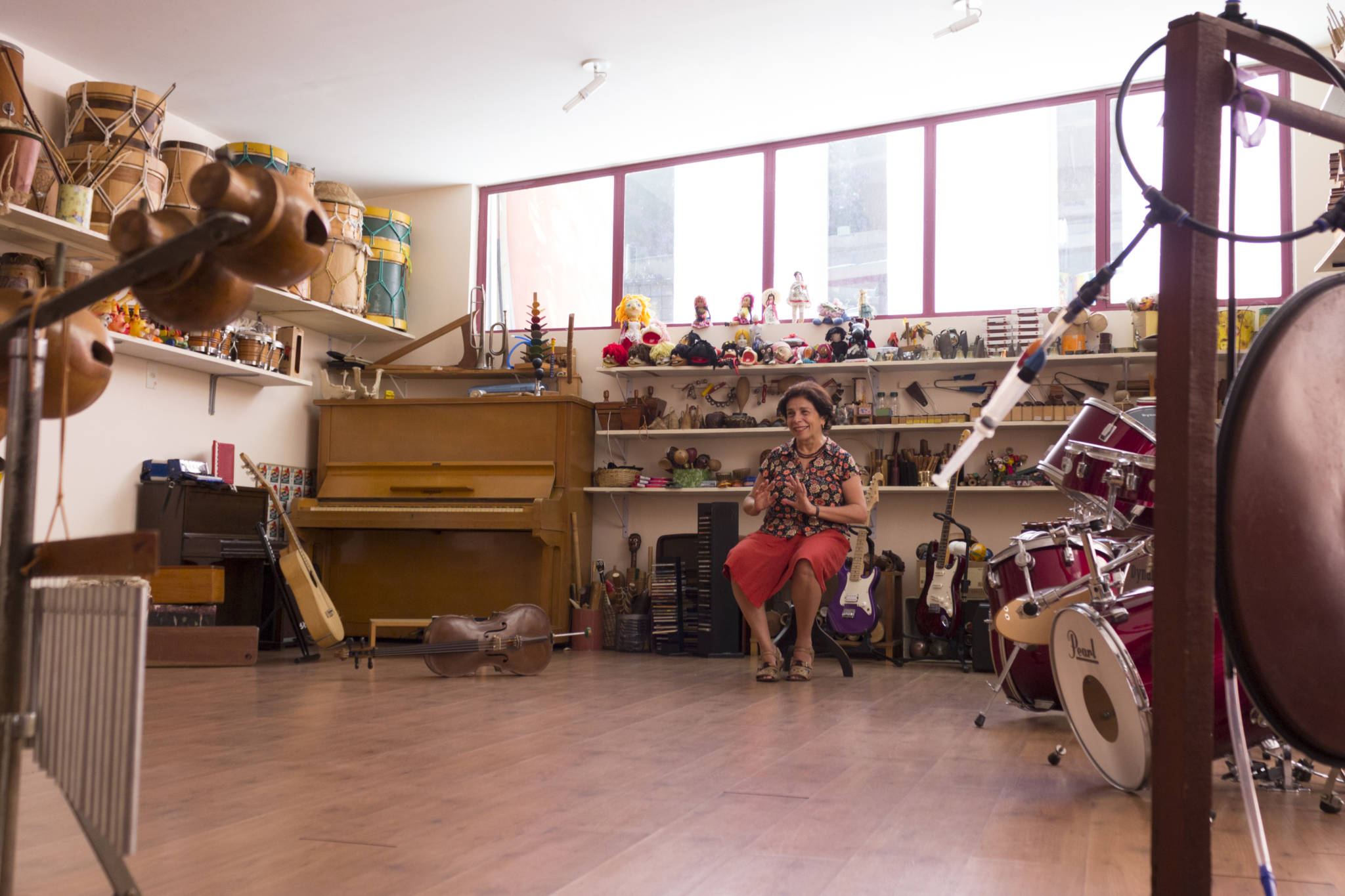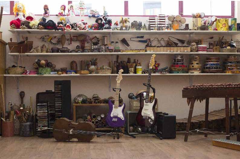 A sala de música abriga o grande acervo de instrumentos musicais da autora reunidos ao longo de sua trajetória, assim como sucatas e materiais variados utilizados na confecção dos instrumentos musicais feitos por alunos e alunas, nos diversos grupos.