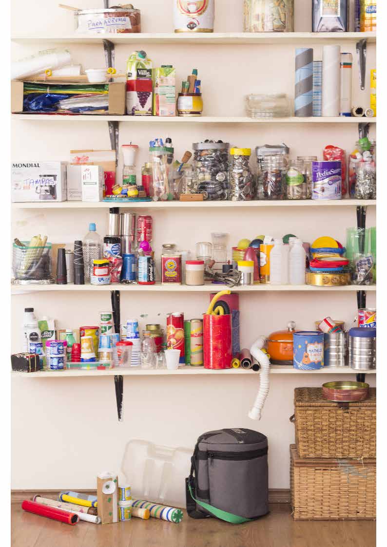 - A sala de musicalização conta também com prateleiras para guardar sucatas e materiais diversos que utilizamos na confecção de instrumentos. Copos e potes plásticos, latas de diversos tipos e tamanhos, capsulas de café, chaves, tampinhas diversas, cones de linha, tubos de papelão, elásticos, fios de nylon, tintas, pinceis, caixas de sapato e, enfim, uma diversidade de materiais que podem ser transformados em materiais sonoros, em instrumentos musicais.