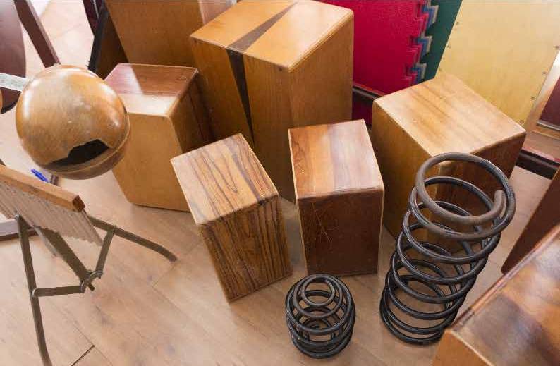 - Próximos às prateleiras com sucatas usadas para criar novos materiais sonoros, encontram-se instrumentos como a zabumba brasileira, o derback turco, o tambor de crioula brasileiro e o tambor do candombe uruguaio. Também é possível observar à direita o steel drum, tambor original de Trinidade e Tobago, feito com partes dos latões de petróleo (o tambor de aço amarelo, com faixa vermelha).
