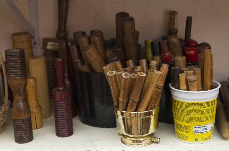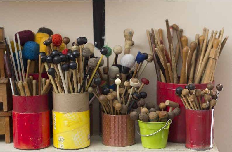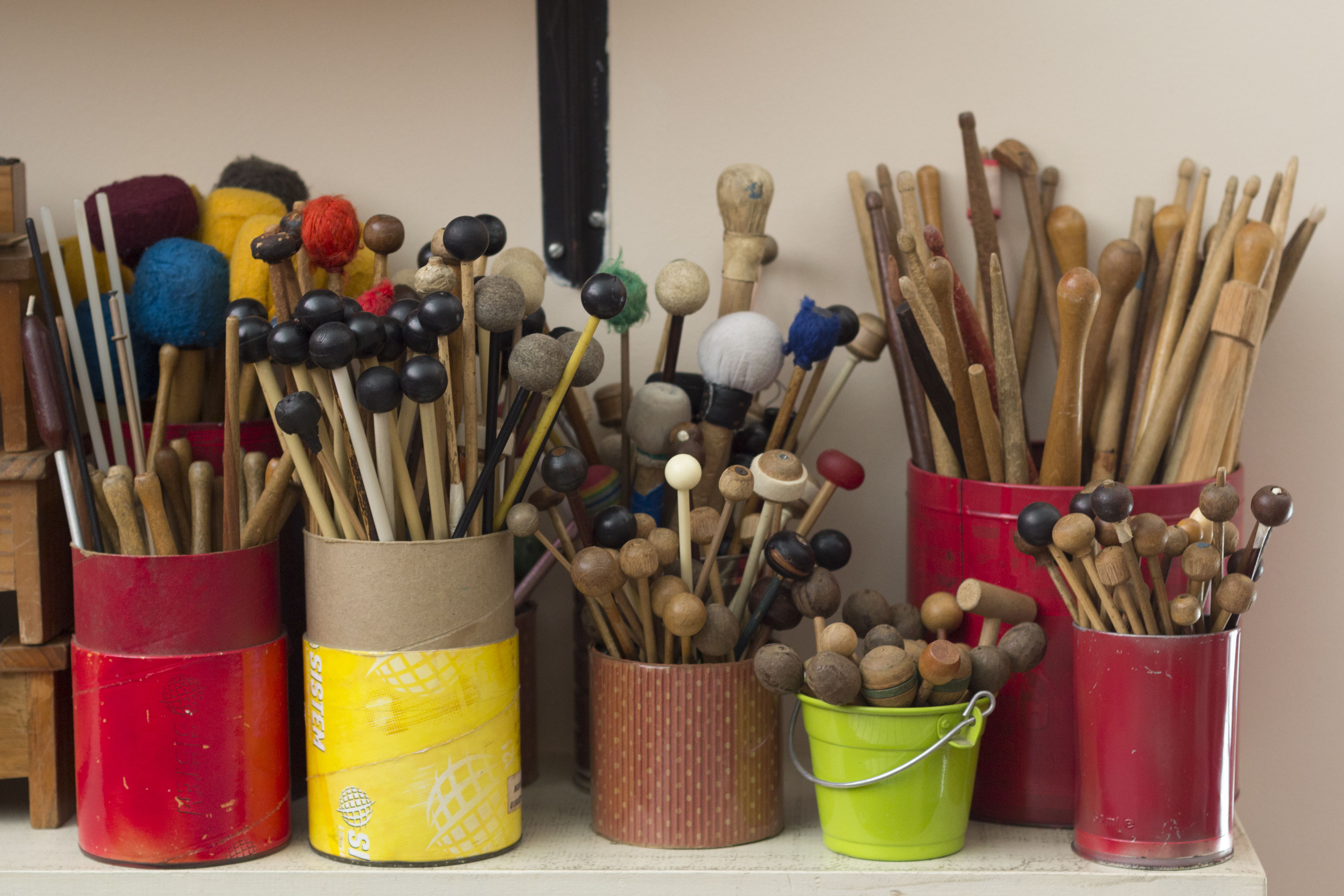 - Baquetas de vários tipos, tamanhos e materiais. Até alguns bilros, usados para tecer a renda, viraram baquetas!
