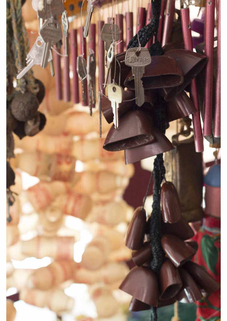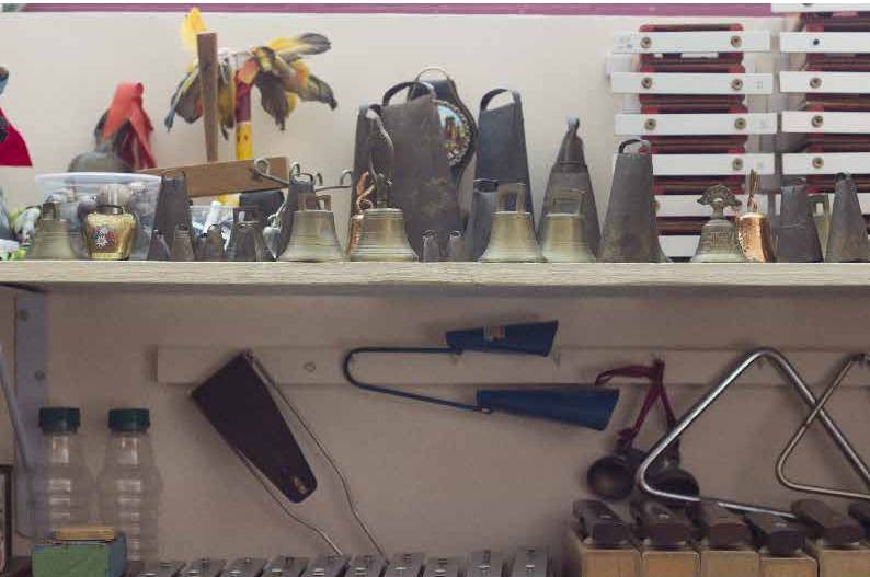 - Neste recorte de uma das prateleiras com instrumentos, ficam evidentes os sinos, utilizados para estimular escutas mais atentas, enquanto encantam e enriquecem as produções sonoro-musicais. Vale muito escutar cada um, criando critérios de seleção: pela altura (mais grave ou mais agudo); pelo timbre, pela potência sonora… Bom escutar um sininho bem leve no ouvido para despertar do relaxamento ou do jogo do escutar, como fazemos constantemente. Também se encontram na prateleira o agogô, triângulos, um xilofone e um metalofone com teclas individuais, um flexaton incompleto e até duas garrafinhas Pet de água com miçangas em seu interior.