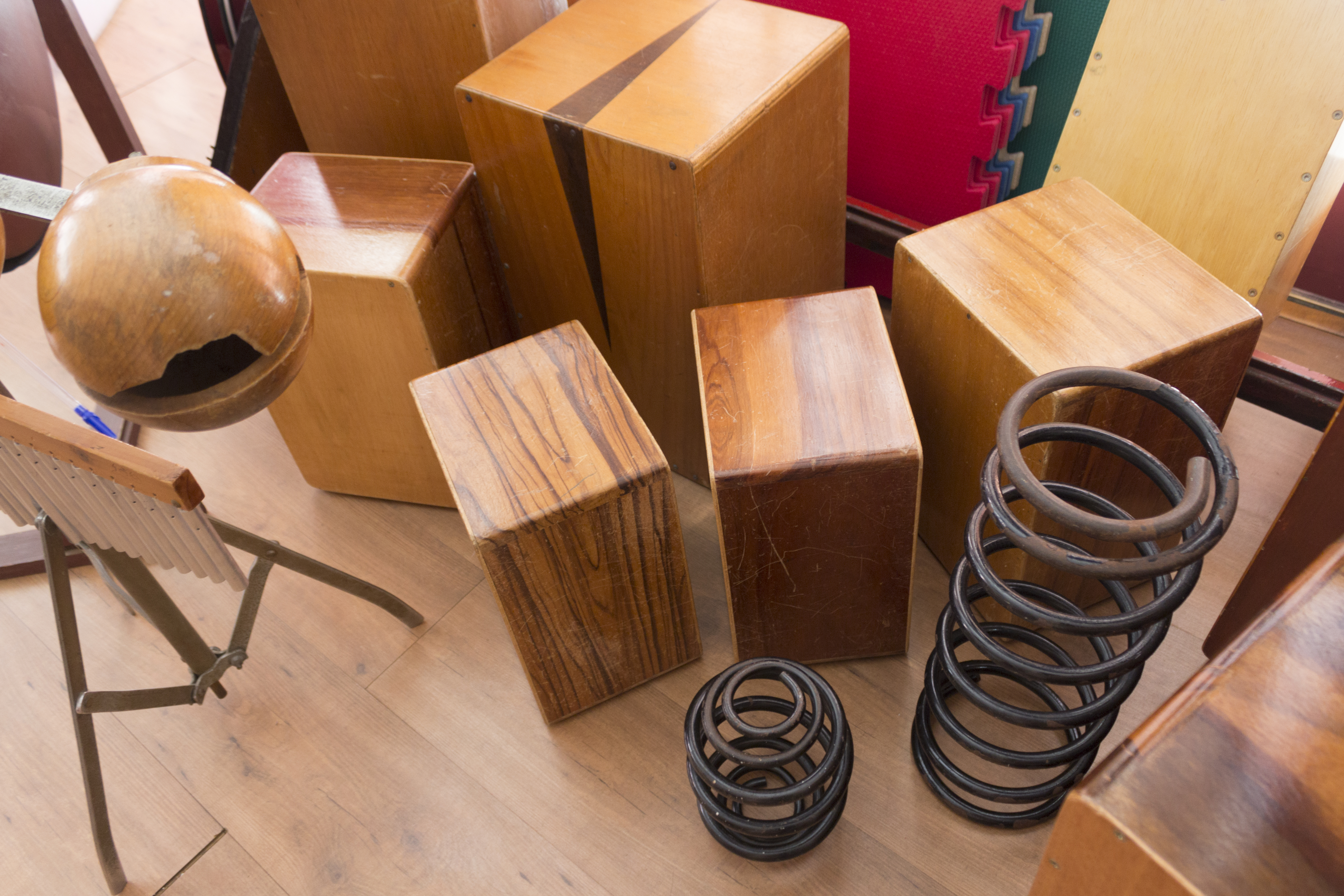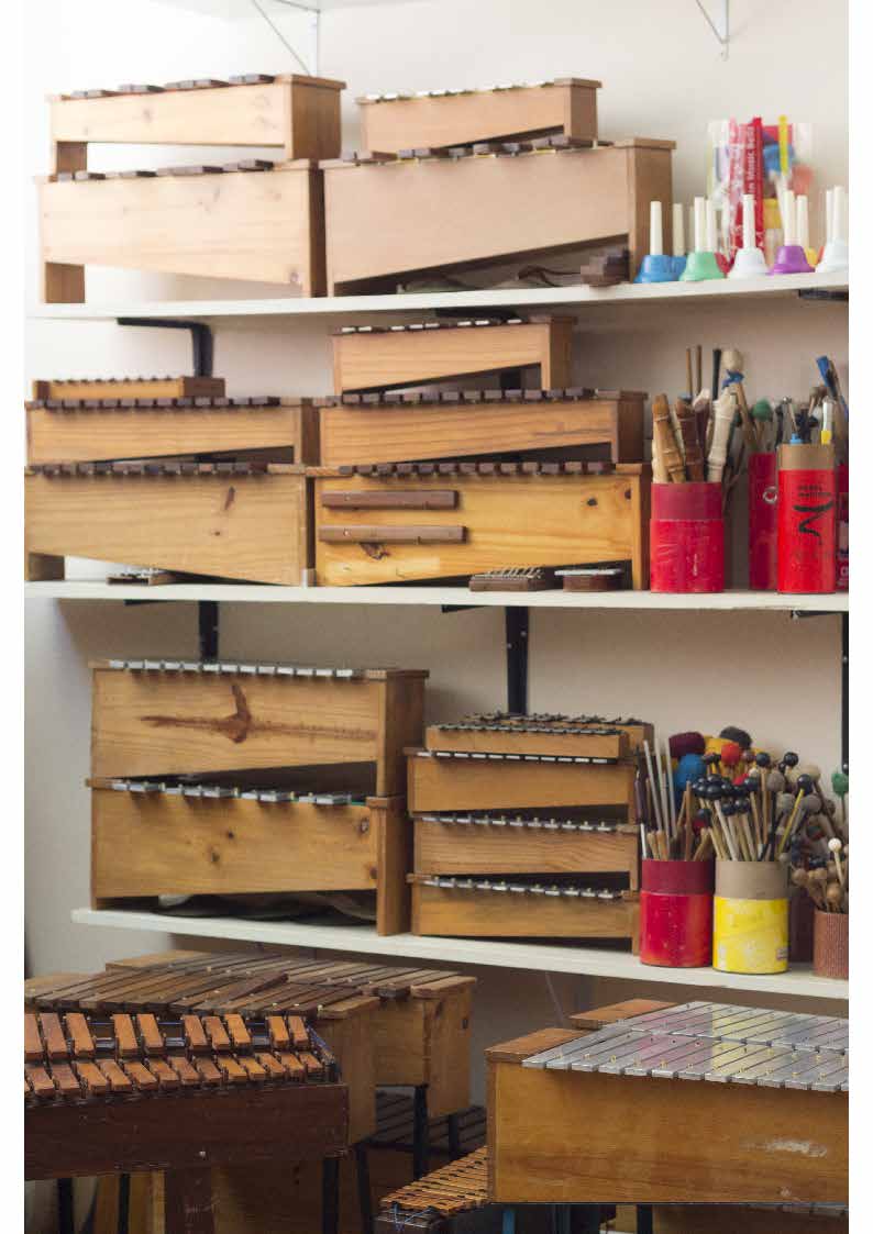 - Nesta imagem, percebemos uma diversidade de materiais sonoros, dos mais comuns a alguns mais raros e distantes de nosso cotidiano sonoro‑musical. Sinos de diversos tamanhos, maracas, ganzás, pandeiros, tamborins, xilofones com placas individuais (ou seja, separadas umas das outras, de modo que cada uma pode tocar uma nota apenas, ou várias, conforme a situação), cocos, afoxé, tambor de chuva e muitas outras coisas. No alto, estão os fantoches e bonecos, que por vezes participam de nossas aulas, seja para convidar as crianças para escolherem os instrumentos que querem tocar, seja para se tornarem personagens de histórias musicadas. À direita, vê-se parte de uma marimba guatemalteca. Destaco ainda a presença das cajitas peruanas no lado esquerdo de uma das prateleiras. Esse instrumento tradicional na cultura peruana consiste em uma caixa de madeira que se pendura no pescoço e percute-se com uma baqueta. Com uma mão, o instrumentista abre e fecha a cajita, e com a outra, ele percute com a caixa, produzindo ritmos que se mesclam ao som produzido pelo abrir e fechar do instrumento.