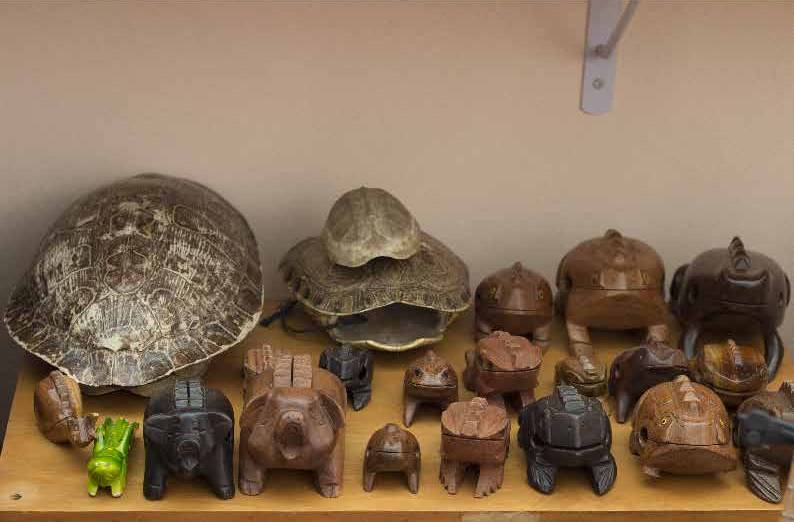 - Ao lado dos vários reco-animais (porco-reco, sapo-reco, gafanhoto-reco…, temos dois exemplos de ayote (ou ayoti), instrumento de percussão de origem centro-americana feito de casco da tartaruga. Percutido ou raspado com uma baqueta, toca-se segurando-o com o braço, como também, apoiando-o em uma superfície qualquer. Pode ser tocado dos dois lados (na parte plana ou na convexa).