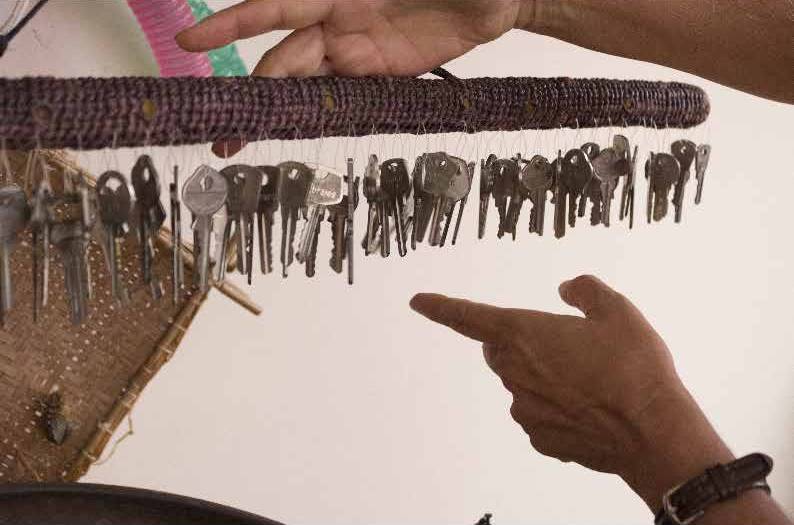 - Grande parte dos materiais que estão nessa parede é utilizada para produzir efeitos sonoros. E a maioria é originária de outras culturas, de outros povos. Mas temos um gonguê utilizado no maracatu pernambucano (o instrumento preto com formato de sino, no alto) e também uma esterija (esteirinha) colombiana, que tocamos raspando uma parte na outra, com o instrumento preso nas duas mãos. Alguns dos materiais são usados no tornozelo, em danças tradicionais (da India, África e América Latina). No alto, vemos os guizos indianos e também outros materiais, feitos com sementes, palha, unhas de lhama e outros recursos naturais. No meio deles, destaco um instrumento muito antigo, feito aqui na escola utilizando uma parte de um chuveiro!