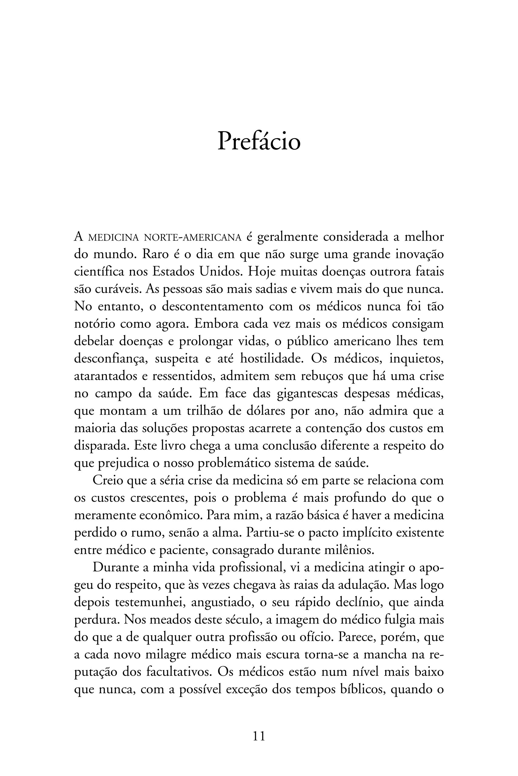 A medicina jamais teve a capacidade de fazer tanto pelo homem como hoje. No entanto, as pessoas nunca estiveram tão desencantadas com seus médicos. A questão é que a maioria dos médicos perdeu a arte de curar, que vai além da capacidade do diagnóstico e da mobilização dos recursos tecnológicos. A chave dessa arte perdida está na relação médico-paciente. Este provocativo livro de um dos mais renomados médicos do mundo mostra a face humana da medicina, em que a arte de curar é tão importante quanto as mais avançadas tecnologias médicas.