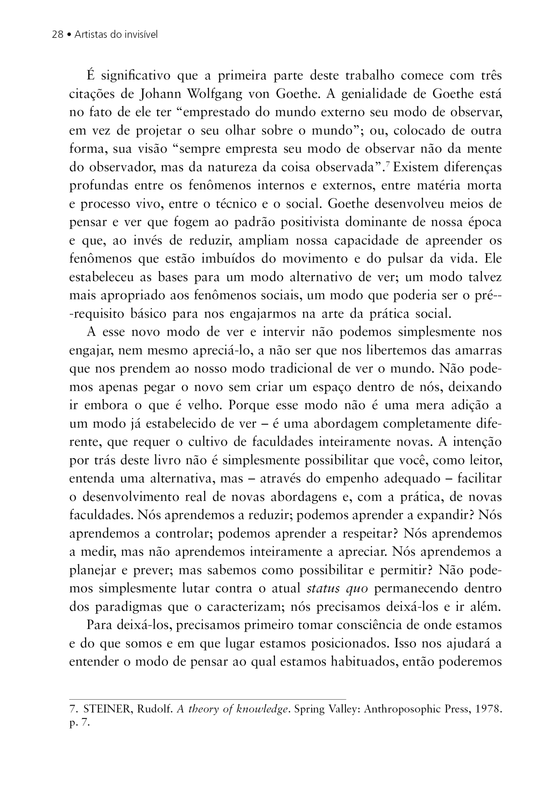 Em Artistas do Invisível, Allan Kaplan apresenta uma abordagem radicalmente nova para a compreensão das organizações e comunidades e para a prática de desenvolvimento social. Confrontando a tendência de se reduzir o desenvolvimento social a uma operação técnica controlável, a abordagem de Kaplan acolhe toda a complexidade do processo de transformação social. Neste livro, o autor escreve baseado em sua vasta experiência adquirida ao longo de anos de consultoria em processos de desenvolvimento – principalmente na África e na Europa -, assim como em seus estudos das obras de Goethe e Jung. Assim, Kaplan nos oferece um ponto de vista diferenciado, com uma abordagem atraente e original da prática do desenvolvimento organizacional e das mudanças de grupo.