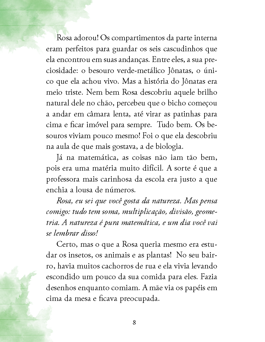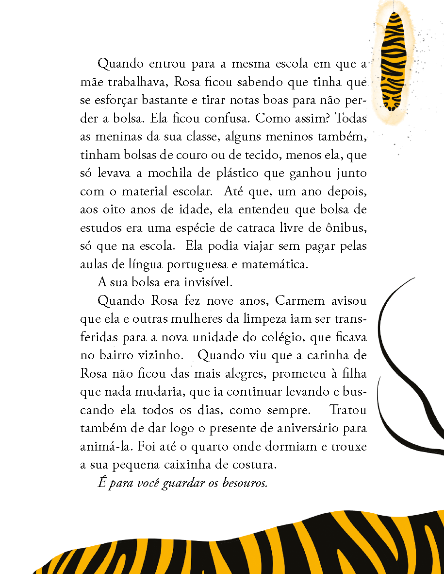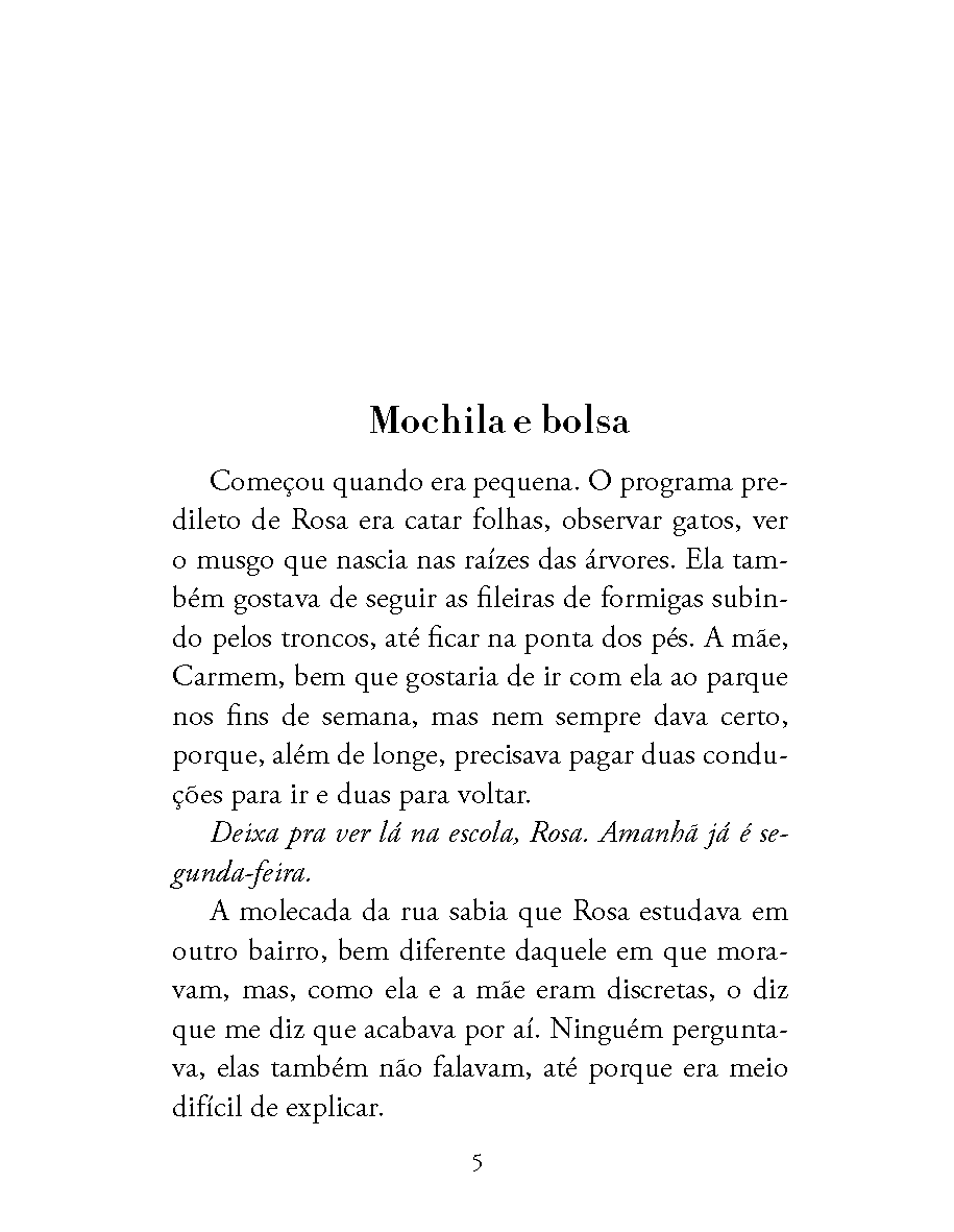 Rosa é amante da biologia. Desde pequena, coleciona folhas e observa animais. Sua mãe trabalha na mesma escola em que Rosa estuda e, por isso mesmo, ela tem uma bolsa muito especial, invisível, que lhe dá o direito de estudar e de frequentar mundos distintos.